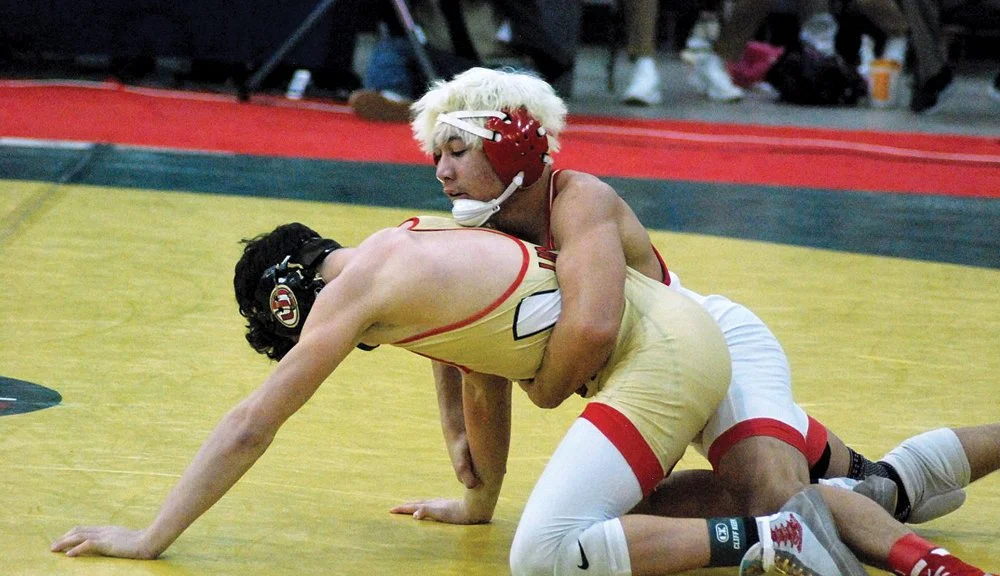 Parkersburg 126-pounder Colston Skeen, top, turned a 2-0 deficit early in the second period against Woodrow Wilson's Garrett Johnson into a 7-2 championship victory Saturday night in Huntington. (Photo by Jay W. Bennett)